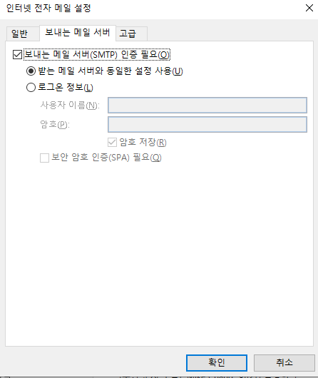 - 보내는 메일 서버 텝에서 보내는 메일 서버(SMTP) 인증 필요에 체크합니다.