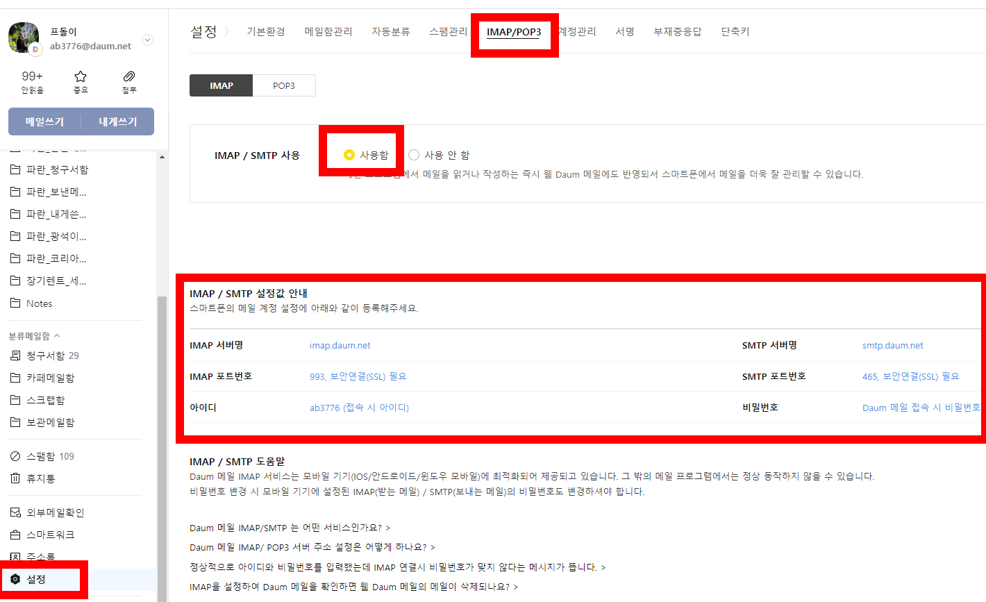 - 설정 화면에서 IMAP/POP3 탭을 클릭하면 아래와 같은 정보가 나와요.