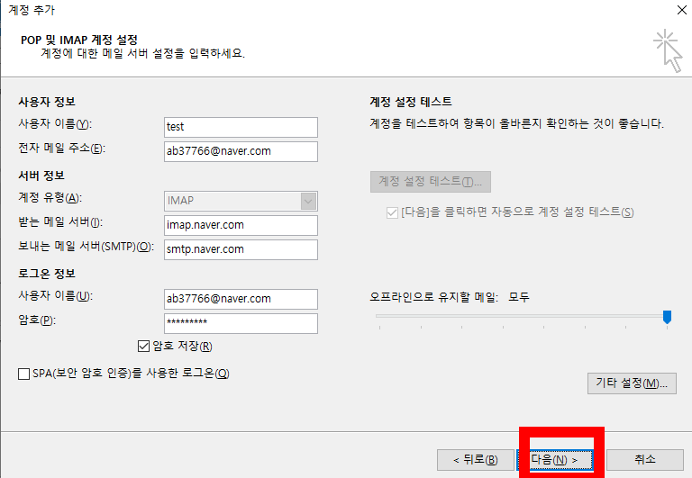 10. 다음 버튼 클릭하면 네이버 메일이 아웃룩에 연동됩니다.