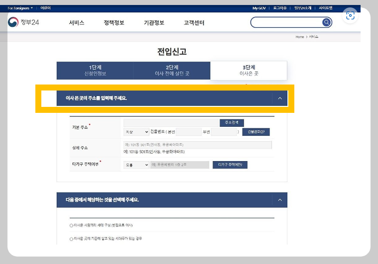 이사 온 곳의 주소지를 입력합니다.