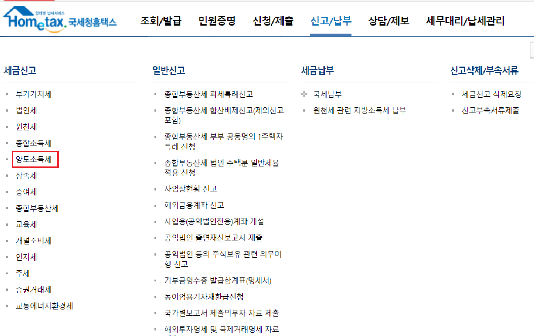 - 신고/납부 메뉴에서 양도소득세를 클릭합니다.