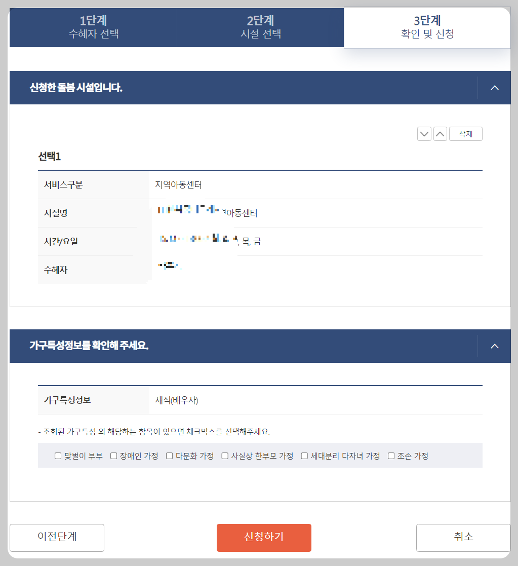 2단계 : 희망 돌봄 시설과 돌봄 시간을 설정합니다.