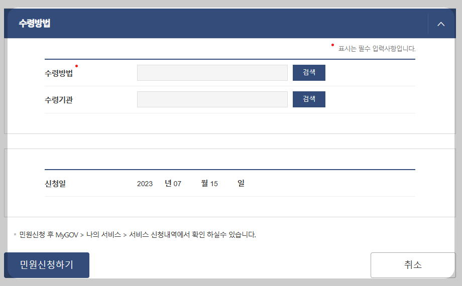 4. 마지막 수령방법을 정하신 후 민원신청하기를 클릭하면 마무리됩니다.