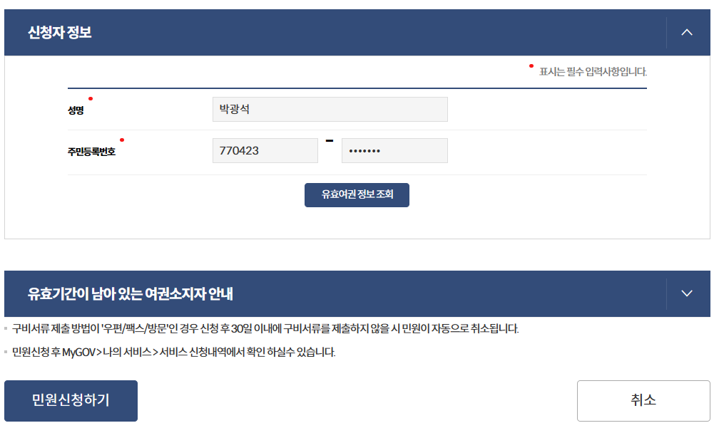 유효기간이 남은 여권을 소지하고 있으면 아래와 같은 화면을 보여 줍니다.