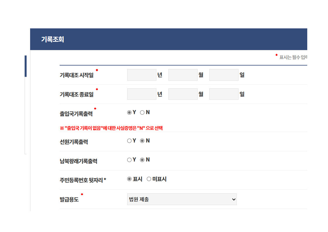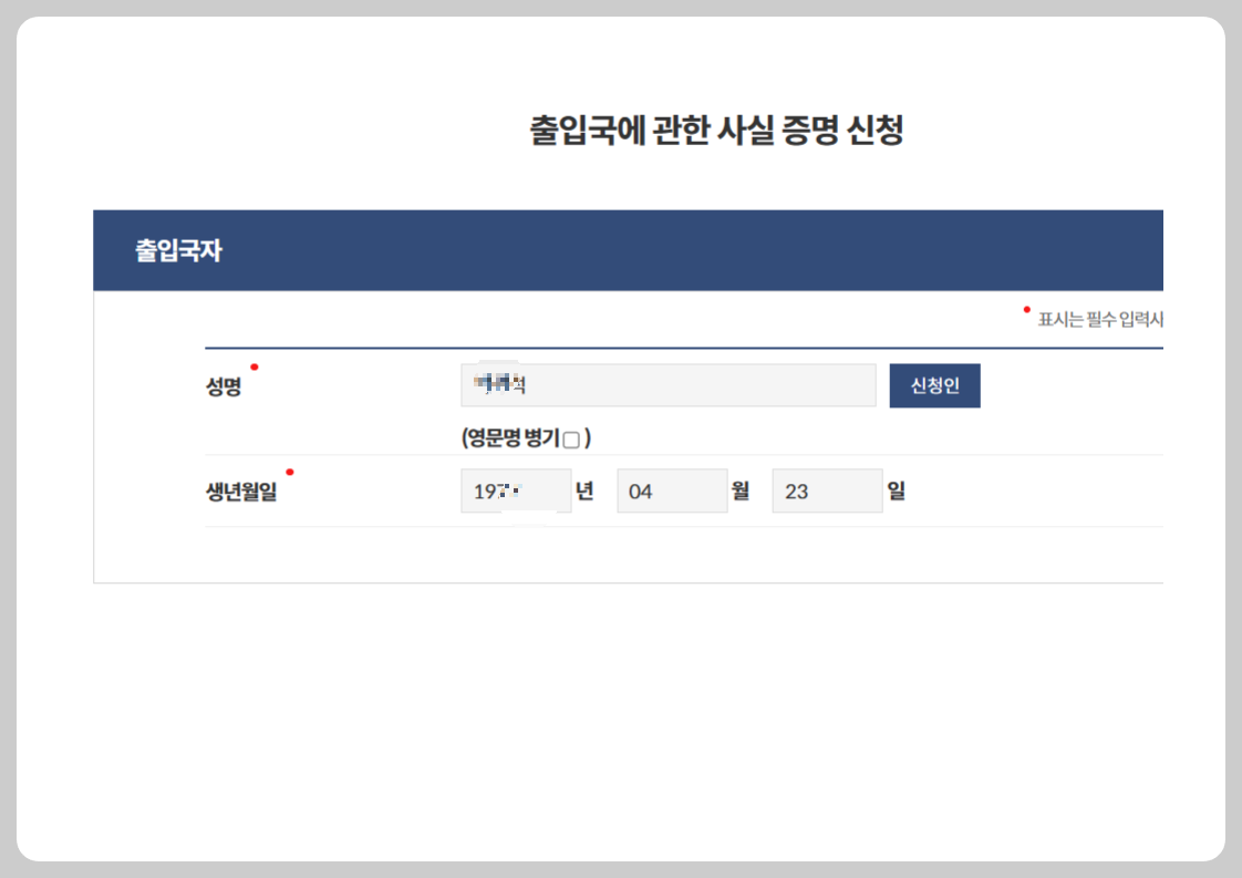 4. 출입국에 관한 사실 증명 신청서를 아래와 같이 순서대로 작성합니다.